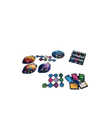 Contiene: 1 Tablero Odyssey, 1 Exoplaneta Central, 8 Exoplanetas de 2 caras, 3 Puertas Espaciales, 4 Modulos Iniciales de Acceso, 1 Taller Espacial, 81 Fichas de Modulo de 2 caras, 4 Fichas de Reorganización, 5 Fichas de Predominio, 208 Figuras de plástico en 4 colores y 1 Libro de Reglas.